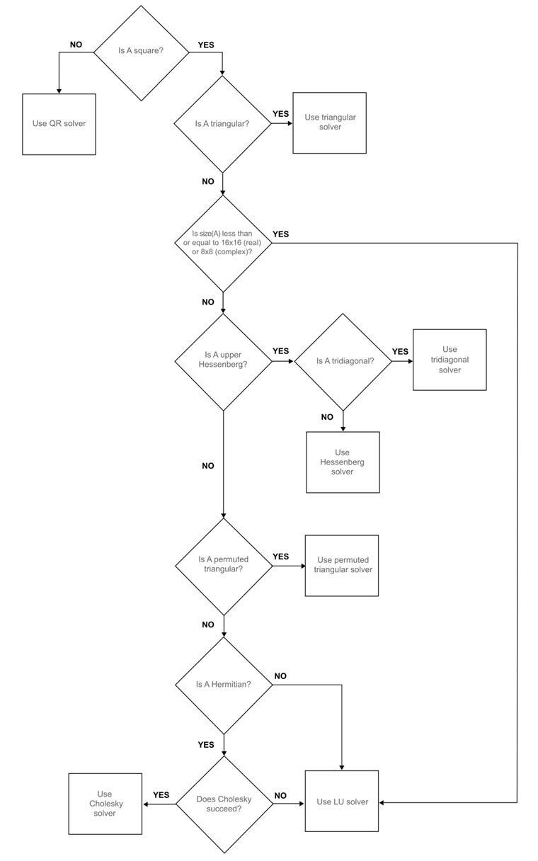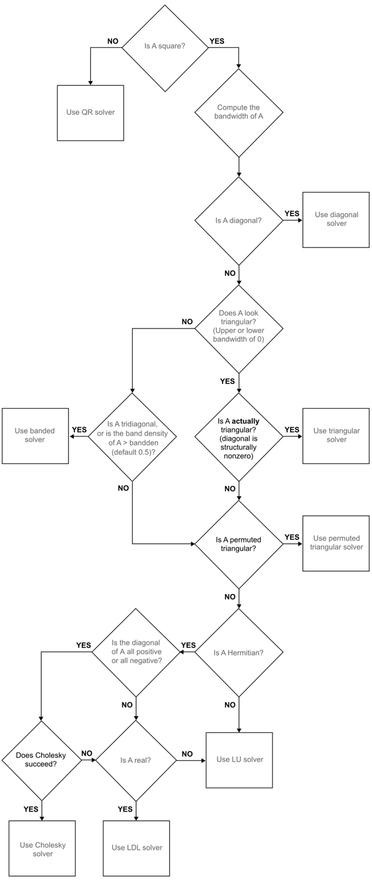 The MATLAB website shows the following flowcharts for how A\b classifies the problem before solving it.