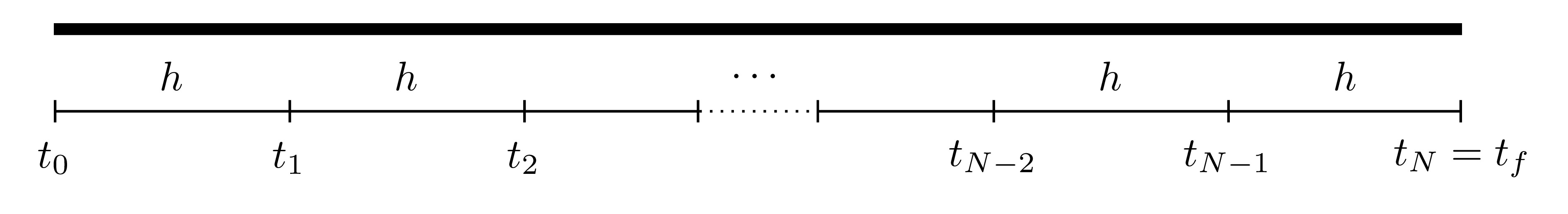 - Discretise the interval \([t_0,t_f]\) with stepsize \(h\) to form the set of points \[\left\{ t_0, t_0+h, t_0+2h, \dots, t_0+Nh \right\}.\]