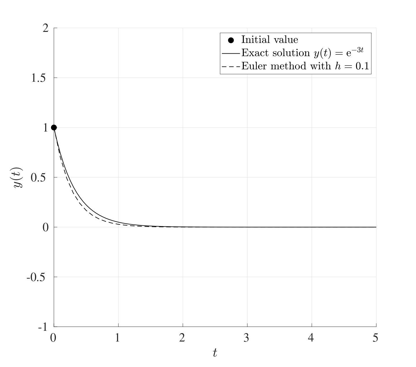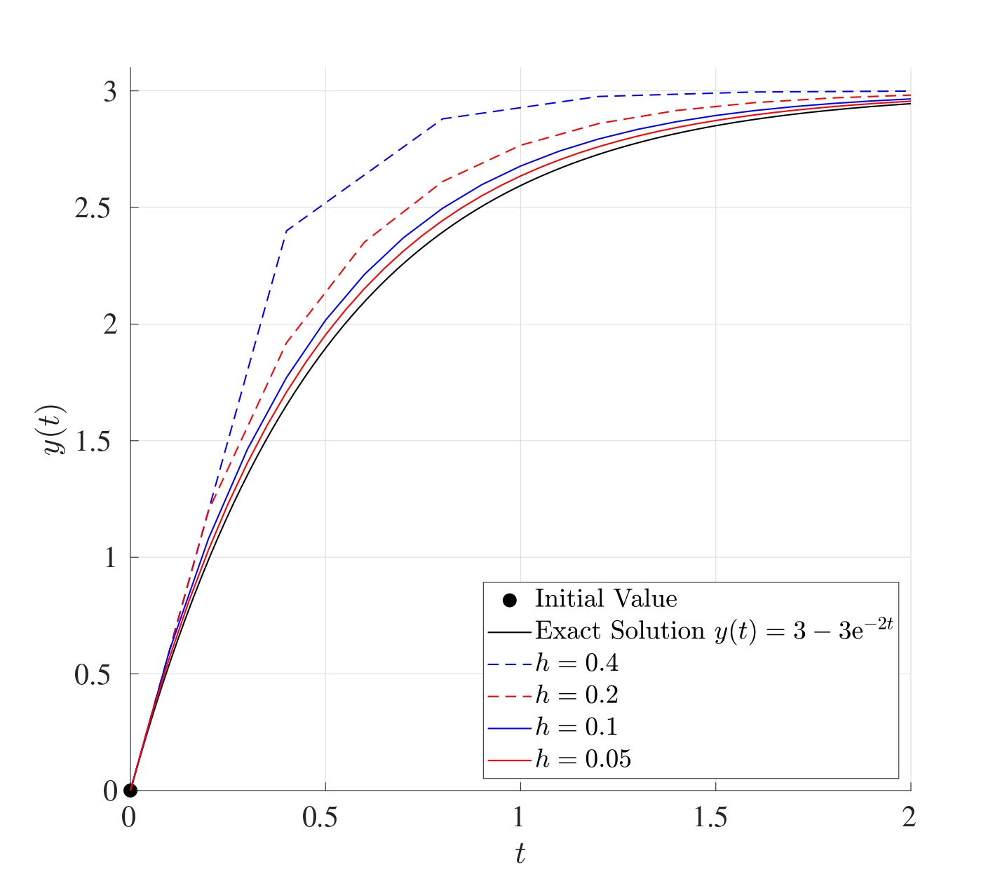 Let \(Y_1\) denote the approximated value of the solution at the point \(t_1\), i.e. \(Y_1 \approx y(t_1)\), so in this case, \[Y_1=y_0+h y'(t_0). \tag{3.1}\] This determines the value of \(Y_1\) which is an approximation to \(y(t_1)\).