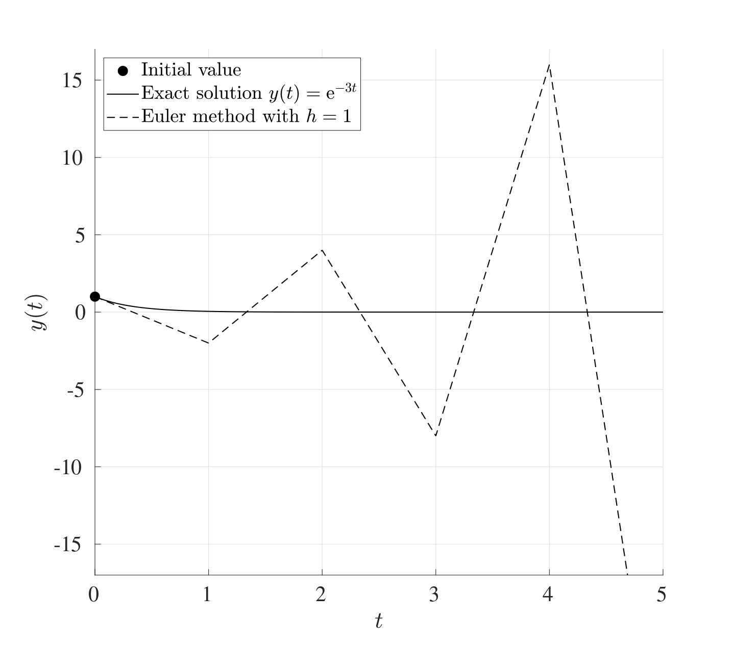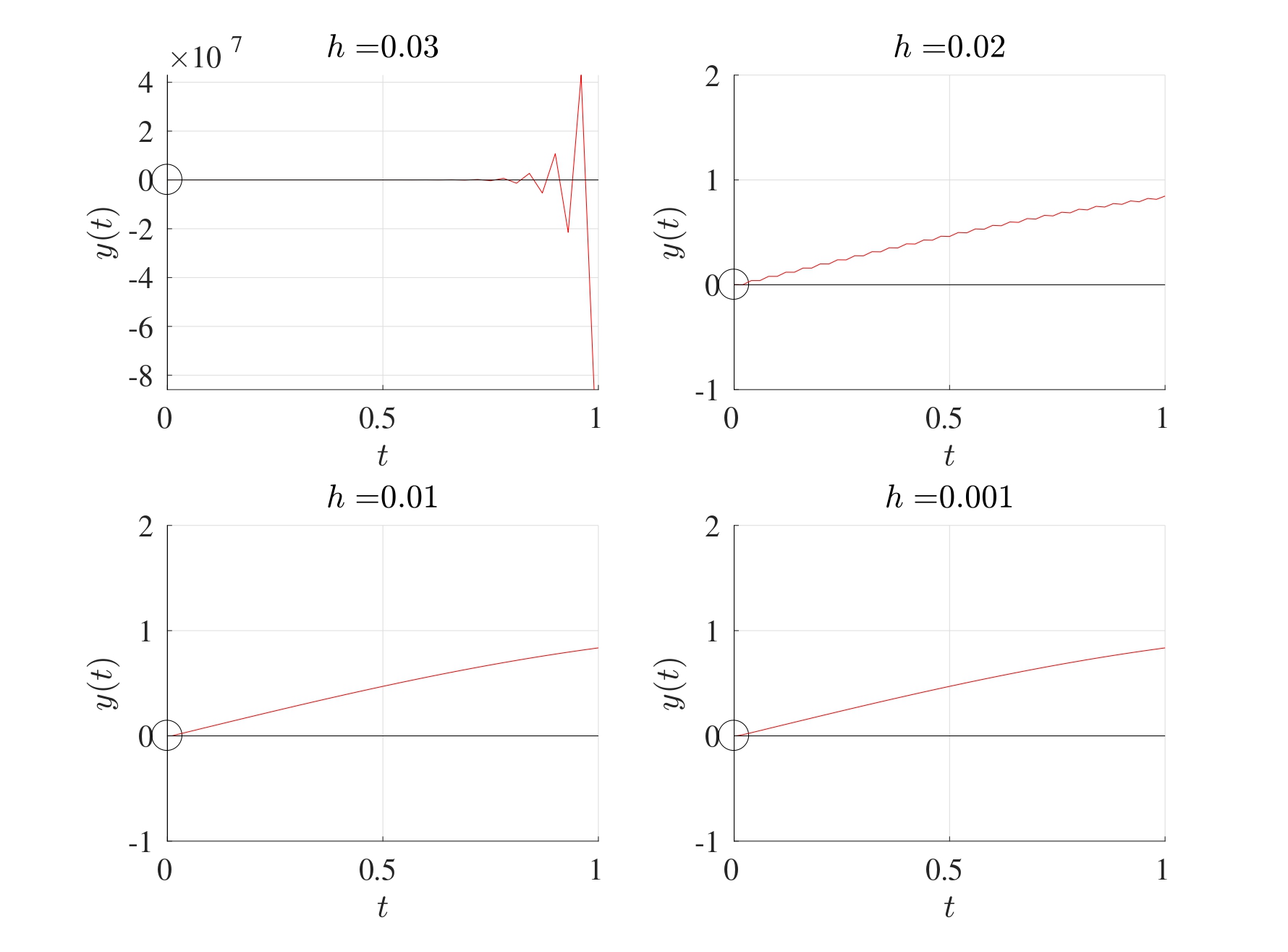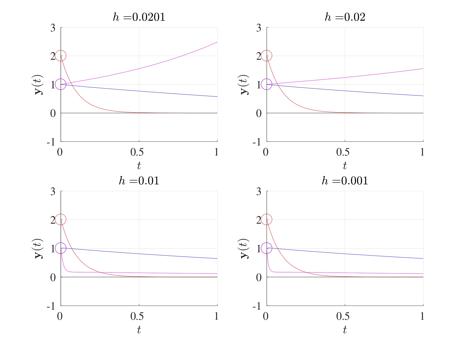 Consider the IVP \[\frac{\mathrm{d} \boldsymbol{y}}{\mathrm{d} t}=A\boldsymbol{y}+\boldsymbol{b} \quad \text{with} \quad \boldsymbol{y}(0)=\boldsymbol{y}_0.\] Let \(\lambda_1, \lambda_2, \dots, \lambda_K\) be the eigenvalues of \(A\). Suppose that the matrix \(A\) is asymptotically stable (i.e. \(\Re(\lambda_k)<0\) for all \(k=1,2,\dots,K\)). In order for the Euler iterations to converge, the stepsize \(h\) needs be less than the threshold stepsize \(h_0\) where \[h_0=2\min_{k=1,2,\dots,K}\left\{ \frac{|\Re(\lambda_k)|}{|\lambda_k|^2} \right\} \tag{3.4}\] \[\text{or} \quad h_0=2 \min_{k=1,2,\dots,K} \left\{ \frac{1}{|\lambda_k|} \right\} \quad \text{if all the eigenvalues are real.}\] In other words, if the initial value problem is asymptotically stable, then the Euler method is stable if an only if \(h<h_0\). This means that the convergence of the Euler is characterised by the eigenvalue that is furthest away from the origin, also called the Dominant Eigenvalue.