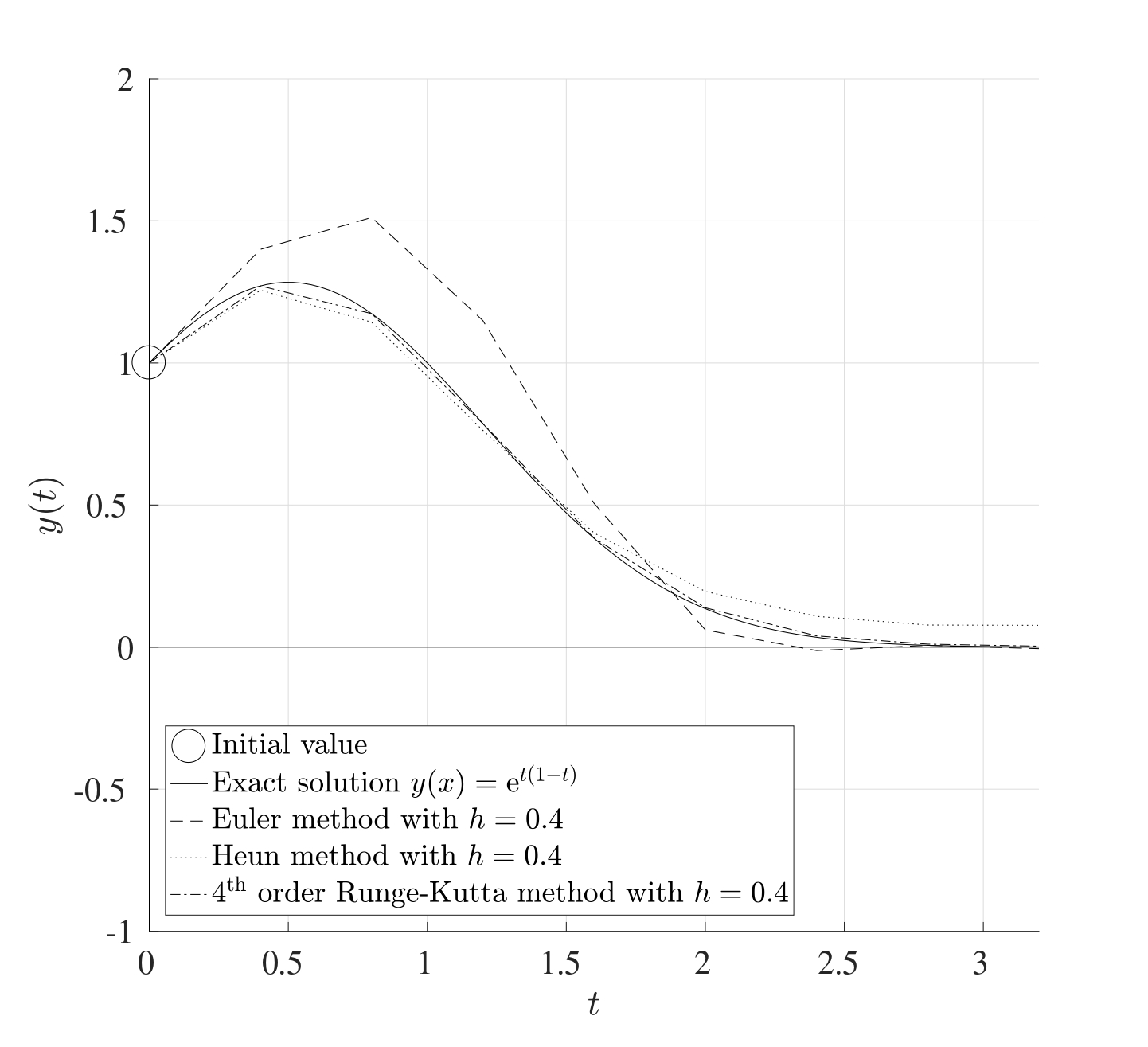 Runge-Kutta methods like this are quite versatile and are generally the most used methods for their accuracy since the stepsize \(h\) does not need to be too small to achieve good results. Even though every step requires four calculations, the value of \(h\) can be made larger in order to reduce the cost but retain considerable accuracy.