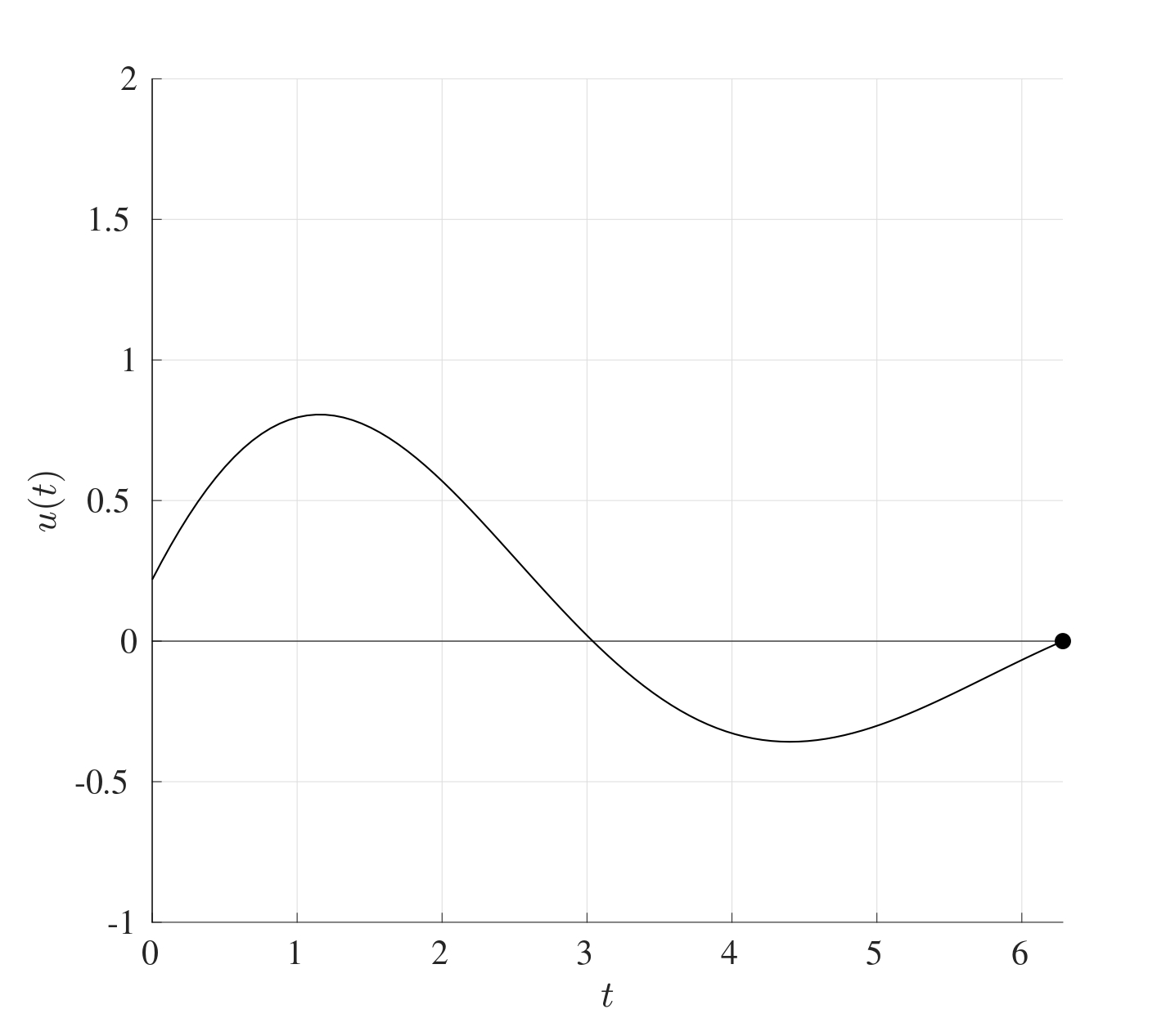 If, on the other hand, the mixed conditions were instead \[u(0)=u_l \quad \text{and} \quad\frac{\mathrm{d} u}{\mathrm{d} x}(L)=\tilde{u}_r,\] then the artificial point will be located at \(x=x_{N+1}\) but the same procedure can be done give the matrix system \(A \boldsymbol{U}=\boldsymbol{g}\) where \[\begin{multline*} \underbrace{\begin{pmatrix} \beta_1 & \gamma_1 & 0 & \dots & 0 & 0 & 0 \\ \alpha_2 & \beta_2 & \gamma_2 & \dots & 0 & 0 & 0 \\ 0 & \alpha_3 & \beta_3 & \dots & 0 & 0 & 0 \\ \vdots & \vdots & \vdots & \ddots & \vdots & \vdots & \vdots \\ 0 & 0 & 0 & \dots & \beta_{N-2} & \gamma_{N-2} & 0 \\ 0 & 0 & 0 & \dots & \alpha_{N-1} & \beta_{N-1} & \gamma_{N-1} \\ 0 & 0 & 0 & \dots & 0 & \alpha_{N}+\gamma_N & \beta_{N} \end{pmatrix}}_{A} \underbrace{\begin{pmatrix} U_1 \\ U_2 \\ U_3 \\ \vdots \\ U_{N-2} \\ U_{N-1} \\ U_{N} \end{pmatrix}}_{\boldsymbol{U}}=\\ \underbrace{\begin{pmatrix} f(x_1)-\alpha_1 u_l \\ f(x_2) \\ f(x_3) \\ \vdots \\ f(x_{N-2}) \\ f(x_{N-1}) \\ f(x_{N})-2h\gamma_{N}\tilde{u}_r \end{pmatrix}}_{\boldsymbol{g}}. \end{multline*}\]