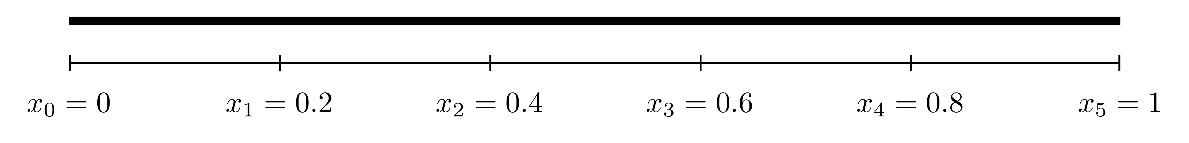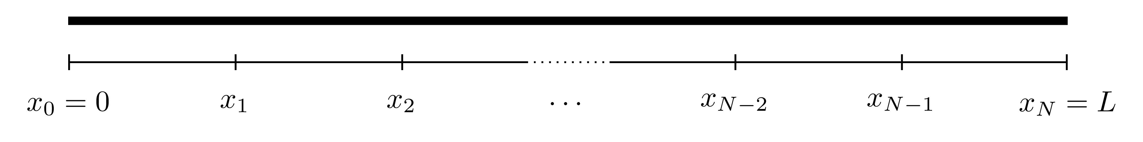 - Divide the spatial interval \([0,L]\) into \(N_x\) equally sized sections and label the points as \(x_0, x_1, x_2, \dots, x_{N_x}\) where \(x_n=nh_x\) and the spatial interval width is \(h_x=\frac{L}{N_x}\).