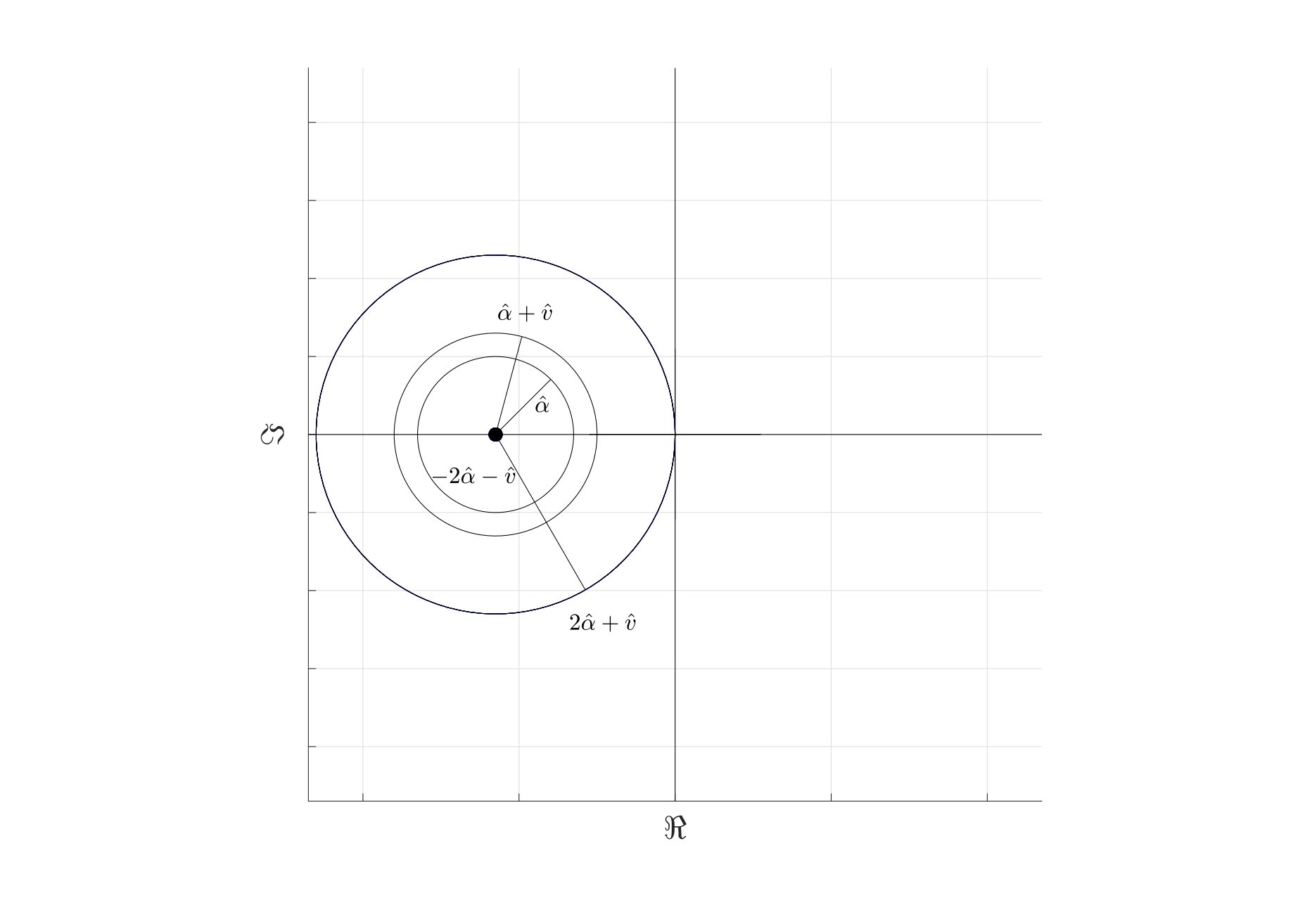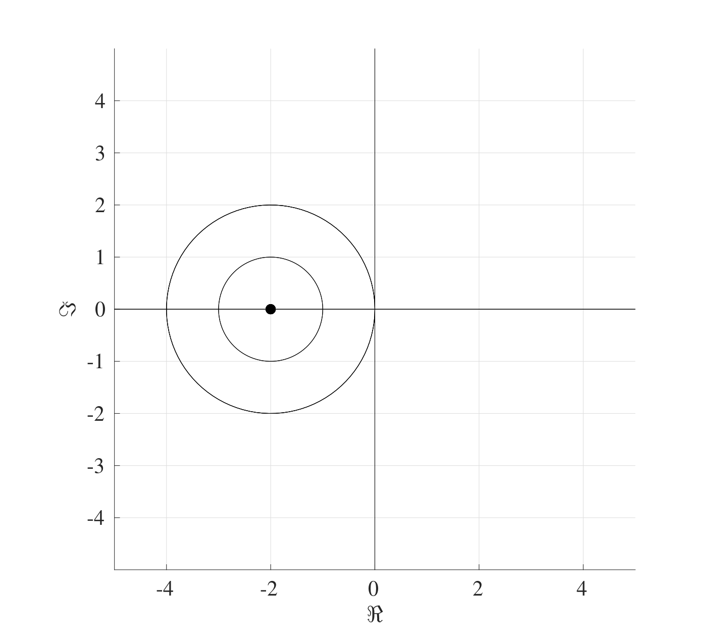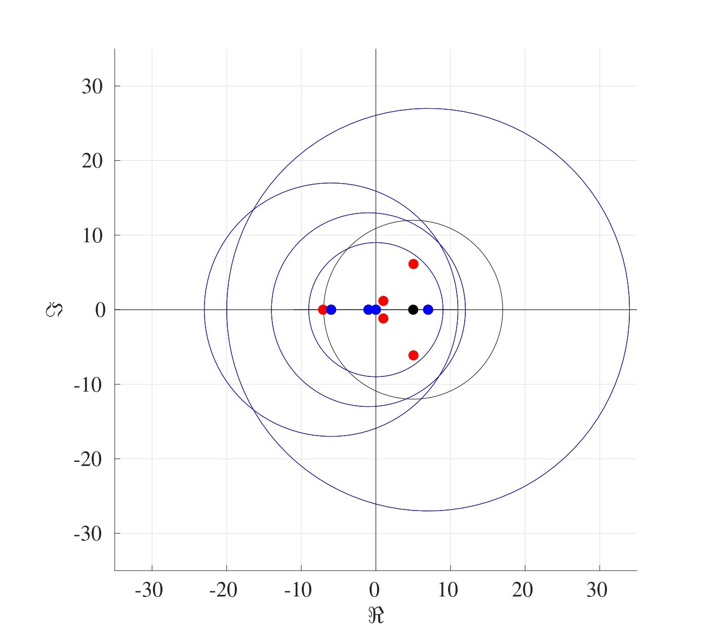 \] The steps of the Gershgorin theorem can be followed to produce the following figure on the complex plane.