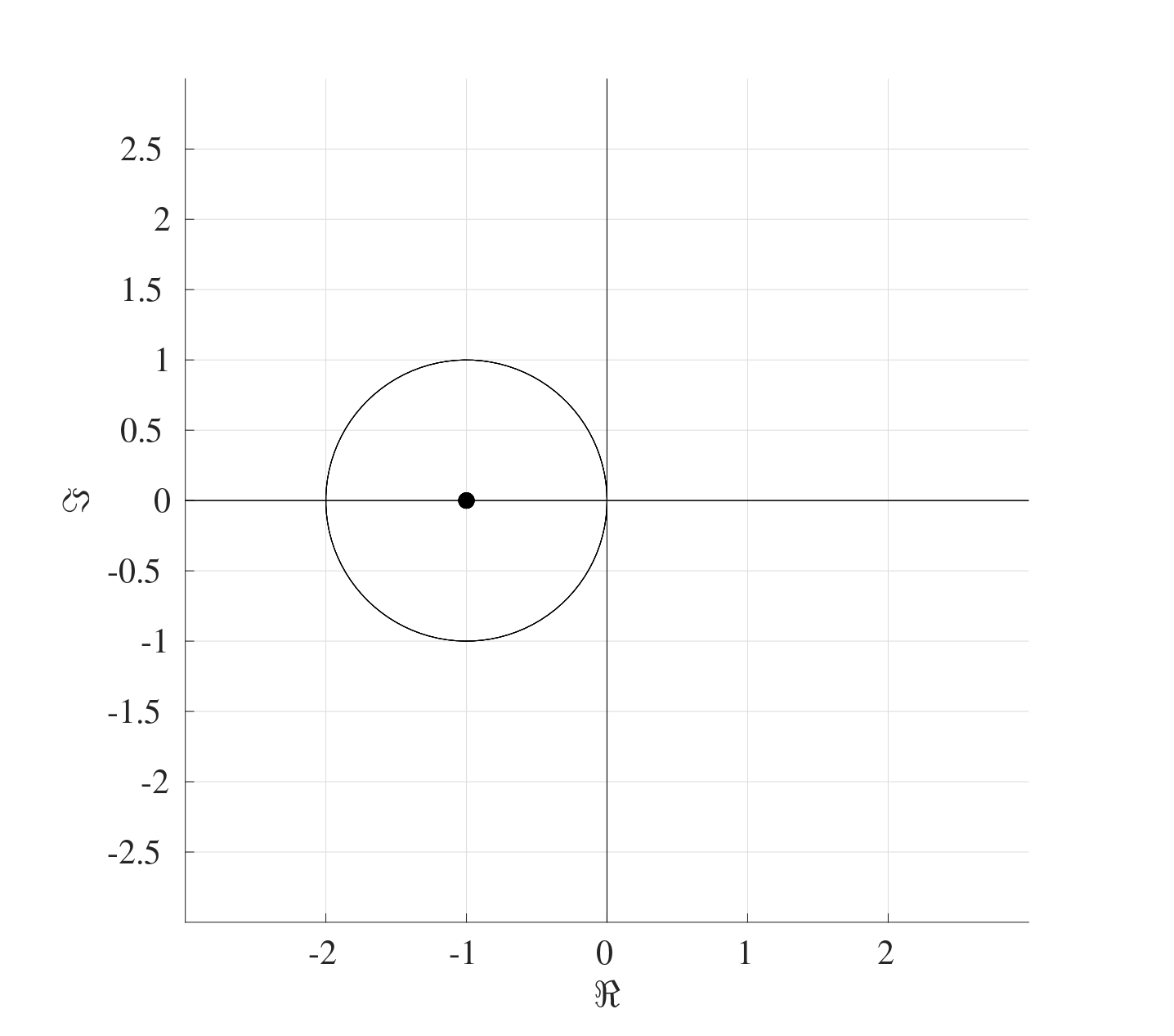 \] Following the steps of the Gershgorin theorem, the centres of all the circles on the complex plane will be located at the diagonal terms, all of which are \(-1\). The radii of these circles are the row sums of the matrix \(A_2\) without the diagonal terms, which means that all the radii will be 1. The figure below shows the circle that results on the complex plane. Therefore regardless of what the eigenvalues might be, it is known that they will always have negative real parts and therefore the advection matrix forms an asymptotically stable system.