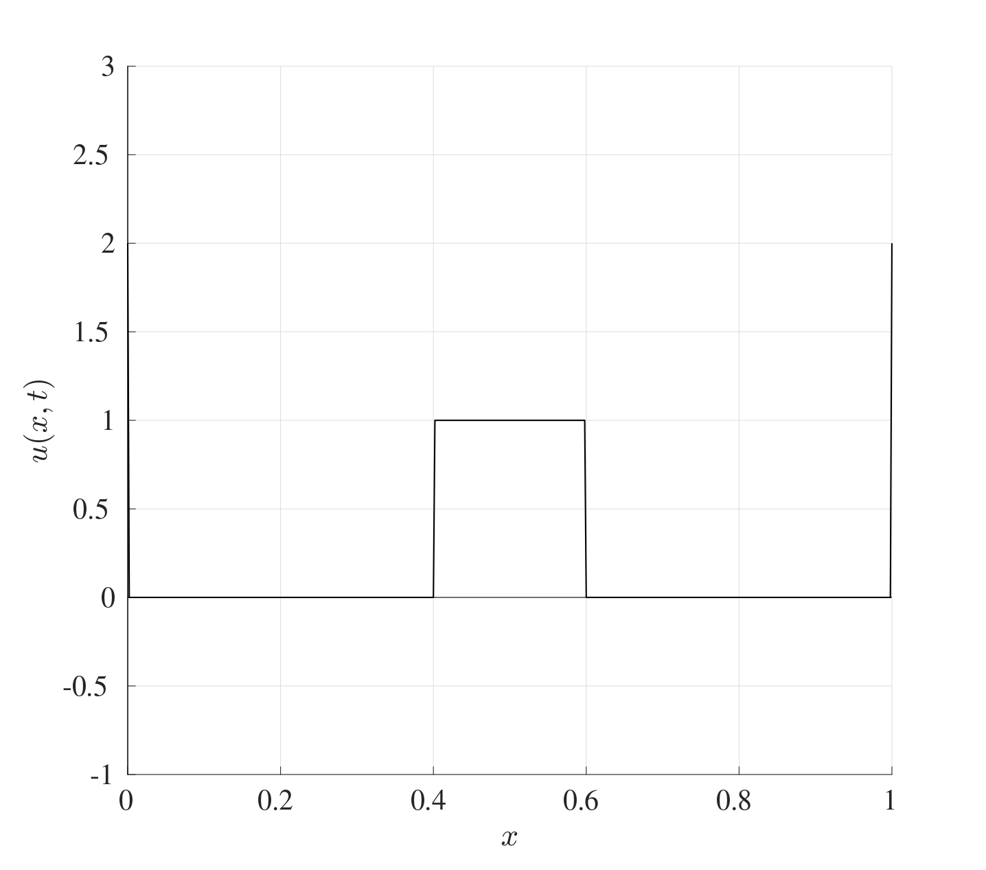 Consider the PDE along with the initial condition only, namely \(u(x,0)=u_{init}(x)\) for \(x \in [0,L]\). The exact solution to this differential equation is given by \[u(x,t)=u_{init}(x-vt),\] this can be verified from the partial differential equation as follows: \[\frac{\partial u}{\partial t}=-v \frac{\partial u}{\partial x} \quad \text{at} \quad u(x,t)=u_{init}(x-vt)\] \[\begin{align*} &\text{LHS}=\frac{\partial }{\partial t}u(x,t)=\frac{\partial }{\partial t}\left( u_{init}(x-vt) \right)=-vu_{init}'(x-vt)\\ &\text{RHS}=\frac{\partial }{\partial x}u(x,t)=\frac{\partial }{\partial x}\left( u_{init}(x-vt) \right)=-vu_{init}'(x-vt). \end{align*}\] This means that if the initial heat profile takes the form of \(u_{init}(x)\), then after time \(t\), the profile will look exactly the same but shifted to the right by a distance \(vt\).