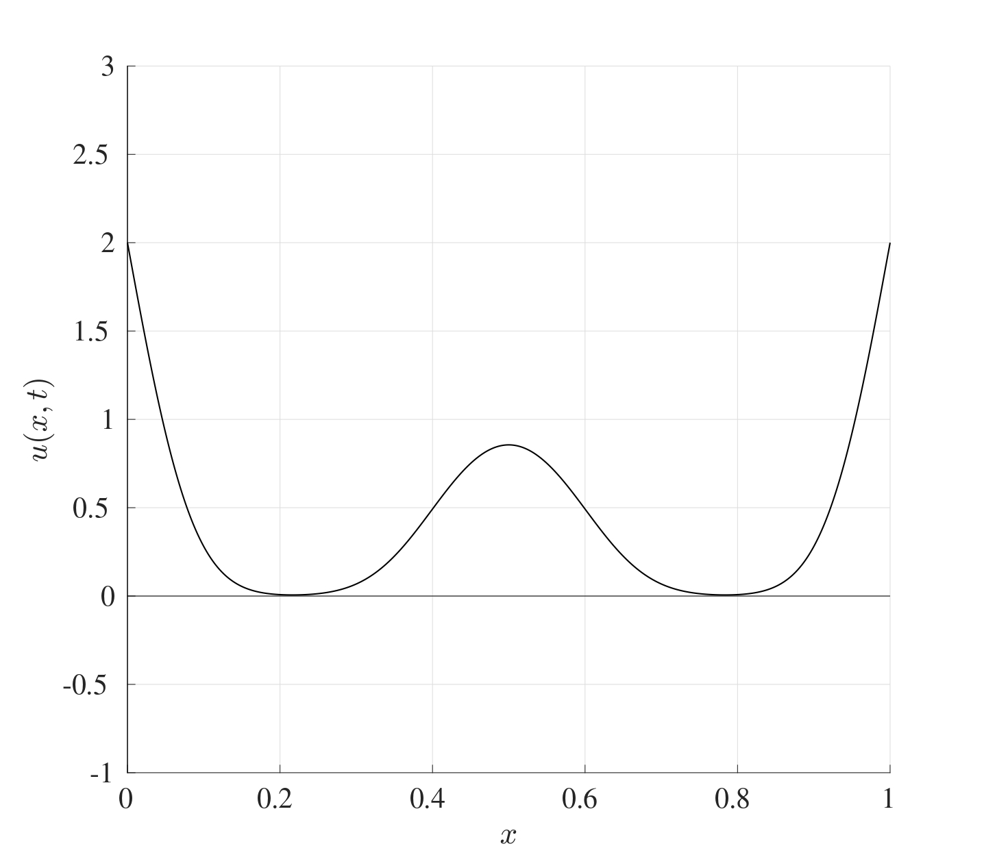 Just as in the heat equation, this partial differential equation has three derivatives in total, two derivatives in \(x\) and one derivative in \(t\), this means that three conditions are needed, two on \(x\) and one on \(t\), these will be as follows: