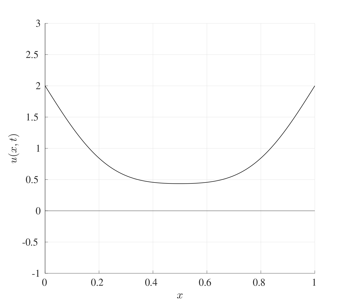 To determine the bound on the stepsize, consider the heat equation after the discretisation, which is \(\frac{\mathrm{d} \boldsymbol{U}}{\mathrm{d} t}=A\boldsymbol{U}+\boldsymbol{b}\) where \(A=\frac{\alpha}{h_x^2}A_1\). The Euler method is numerically stable if the time step \(h_t\) satisfies \[\left\| \mathcal{I}+h_t A \right\|_{\infty} \leq 1.\] First calculate \(\mathcal{I}+h_t A\): \[ \mathcal{I}+h_t A=\mathcal{I}+\frac{\alpha h_t}{h_x^2}A_1= \begin{pmatrix} 1-2\tilde{\alpha} & \tilde{\alpha} & 0 & \dots & 0 & 0 & 0 \\ \tilde{\alpha} & 1-2\tilde{\alpha} & \tilde{\alpha} & \dots & 0 & 0 & 0 \\ 0 & \tilde{\alpha} & 1-2\tilde{\alpha} & \dots & 0 & 0 & 0 \\ \vdots & \vdots & \vdots & \ddots & \vdots & \vdots & \vdots\\ 0 & 0 & 0 & \dots & 0& \tilde{\alpha} & 1-2\tilde{\alpha} \end{pmatrix} \] where \(\tilde{\alpha}=\frac{\alpha h_t}{h_x^2}\). Now taking the absolute value of all the terms and taking the row sums gives: \[ \mathrm{abs}\left( \mathcal{I}+\frac{\alpha h_t}{h_x^2}A_1 \right)= \begin{pmatrix} |1-2\tilde{\alpha}| & \tilde{\alpha} & 0 & \dots & 0 & 0 & 0 \\ \tilde{\alpha} & |1-2\tilde{\alpha}| & \tilde{\alpha} & \dots & 0 & 0 & 0 \\ 0 & \tilde{\alpha} & |1-2\tilde{\alpha}| & \dots & 0 & 0 & 0 \\ \vdots & \vdots & \vdots & \ddots & \vdots & \vdots & \vdots\\ 0 & 0 & 0 & \dots & 0& \tilde{\alpha} & |1-2\tilde{\alpha}| \end{pmatrix}\begin{matrix} \to \; \; \tilde{\alpha}+|1-2\tilde{\alpha}| \\ \to 2\tilde{\alpha}+|1-2\tilde{\alpha}|\\ \to 2\tilde{\alpha}+|1-2\tilde{\alpha}|\\ \vdots \\ \to \; \; \tilde{\alpha}+|1-2\tilde{\alpha}|. \end{matrix} \] The row sums of the absolute terms of this matrix are \[a=\tilde{\alpha}+|1-2\tilde{\alpha}| \quad \text{and} \quad b=2\tilde{\alpha}+|1-2\tilde{\alpha}|.\] Since \(tilde{\alpha}>0\), then \(b>a\) and therefore, \(\left\| \mathcal{I}+h_tA \right\|_{\infty}=b=2\tilde{\alpha}+|1-2\tilde{\alpha}|\). Consider the two cases \(1-2\tilde{\alpha}>0\) and \(1-2\tilde{\alpha}<0\).