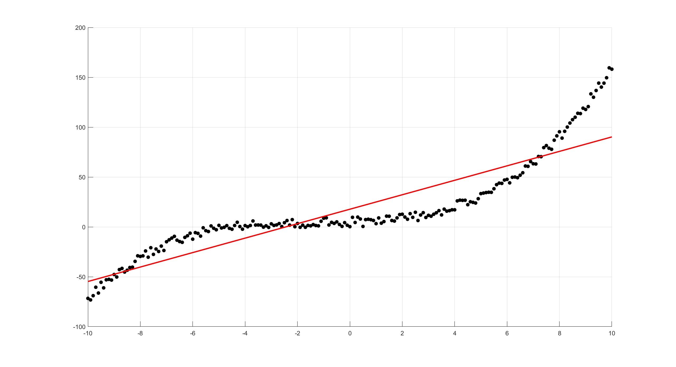 For instance, consider a set of \(M\) data points (or measurements) \((t_i,y_i)\) for \(i=1,2,\dots,M\). The idea behind linear regression is to find a parameter vector \(\boldsymbol{x} \in \mathbb{R}^N\) such that the linear function \(y\) given by \[y(t)=f(x,t)=\sum_{j=1}^N{x_j\varphi_j(t)}\] can approximate the data in the best possible way, by reducing the error between the measurement \((t_i,y_i)\) and the approximation \((t_i,y(t_i))\).
