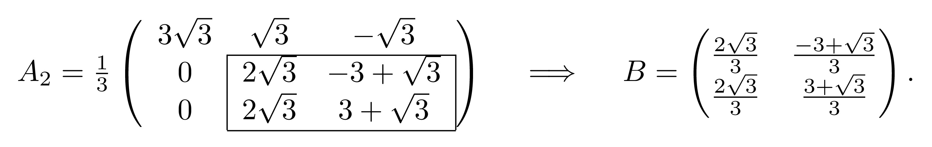 Consider the matrix \[A_2=\frac{1}{3}\begin{pmatrix} 3\sqrt{3} & \sqrt{3} & -\sqrt{3} \\ 0 & 2\sqrt{3} & -3+\sqrt{3} \\ 0 & 2\sqrt{3} & 3+\sqrt{3} \end{pmatrix}.\] Let \(B\) be the bottom right \(2 \times 2\) submatrix of \(A_2\),