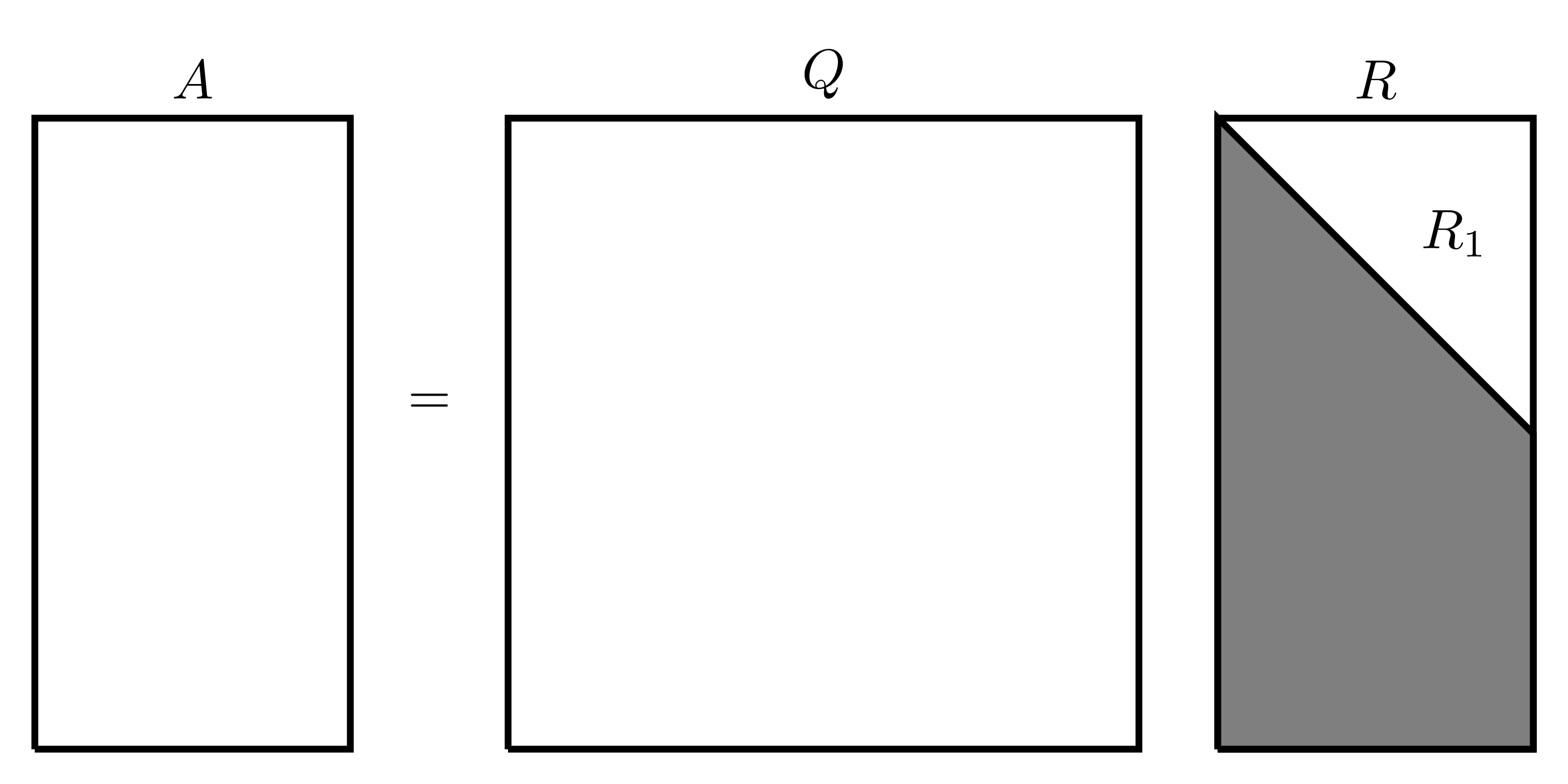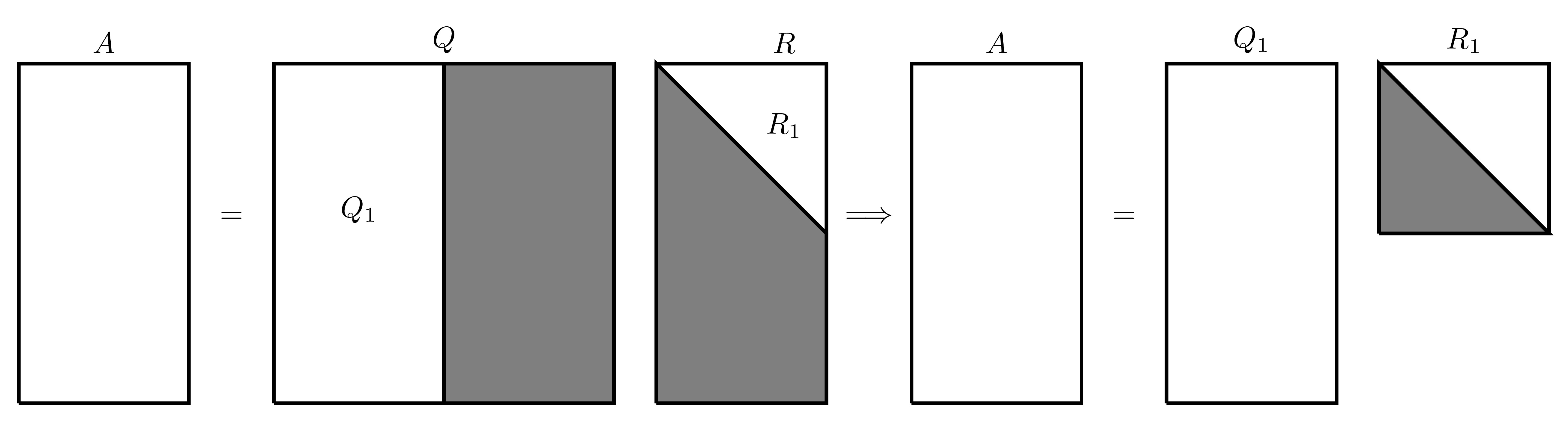 There is a much more concise form of the QR factorisation where only the first several columns of \(Q\) are considered since the rest will be multiplied by 0 anyway, this gives an “economy version” of the QR factorisation written as \(A=Q_1R_1\) which be visually represented as follows: