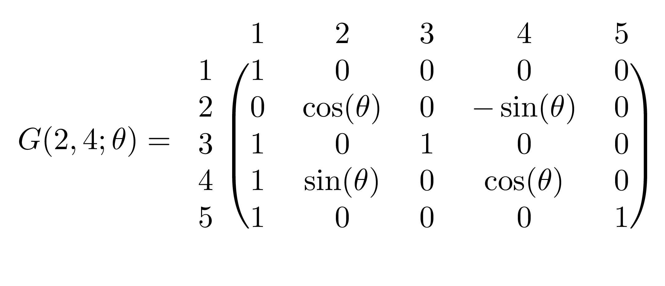 The Givens Rotation Matrix (named after James Wallace Givens) represents a rotation in the plane that can be spanned by two vectors. The matrix of transformation is denoted \(G(i,j;\theta)\) where the vector \(G(i,j;\theta)\boldsymbol{x}\) is simply the vector \(\boldsymbol{x}\) rotated \(\theta\) radians anti-clockwise on a plane that is parallel to the \((i,j)\)-plane. The matrix \(G(i,j;\theta)\) is essentially an identity matrix with the \((i,i)\) and \((j,j)\) terms replaced by \(\cos(\theta)\), the \((i,j)\) term replaced by \(\sin(\theta)\) and the \((j,i)\) term replaced by \(-\sin(\theta)\). For example, in \(\mathbb{R}^5\), the matrix \(G(2,4;\theta)\) is
