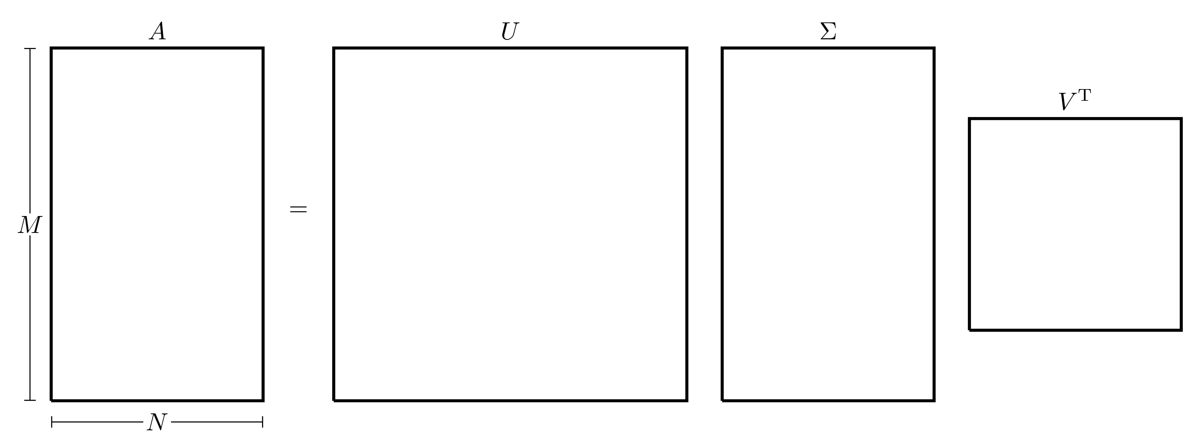 For \(A \in \mathbb{R}^{M \times N}\), orthogonal matrices \(U \in \mathbb{R}^{M \times M}\) and \(V \in \mathbb{R}^{N \times N}\) can always be found such that \(AV=U\Sigma\) where \(\Sigma \in \mathbb{R}^{M \times N}\) is a diagonal matrix that can be written as \(\Sigma=\mathrm{diag}(\sigma_1, \sigma_2, \dots, \sigma_p)\) where \(p=\min \left\{ M,N \right\}\) whose entries are positive and arranged in descending order, i.e. \[\sigma_1 \geq \sigma_2 \geq \dots \geq \sigma_p \geq 0.\] Since \(V\) is an orthogonal matrix, then \(A\) can be written as \(A = U\Sigma {V}^{\mathrm{T}}\), this form is called the Singular Value Decomposition (SVD) of \(A\). If \(M>N\), this can be illustrated as follows: