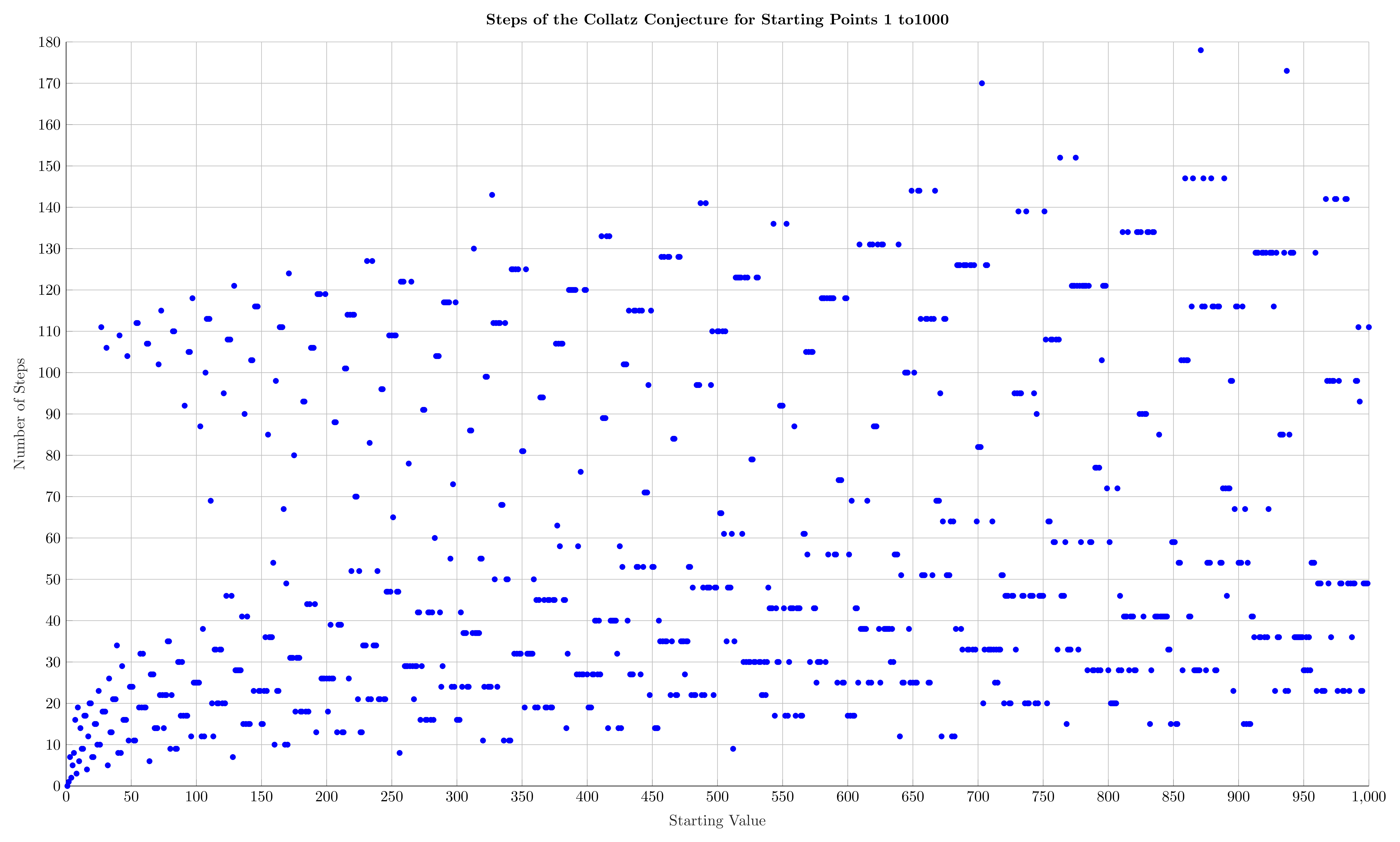 title(strcat('Steps of the Collatz Conjecture for Starting Points 1 to',' ',num2str(N)),'Interpreter','Latex')
